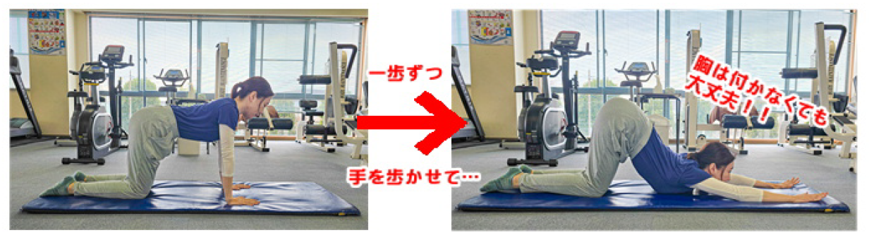 - お尻の位置(高さ)をキープしたまま両手を前の方に伸ばしていきます。
