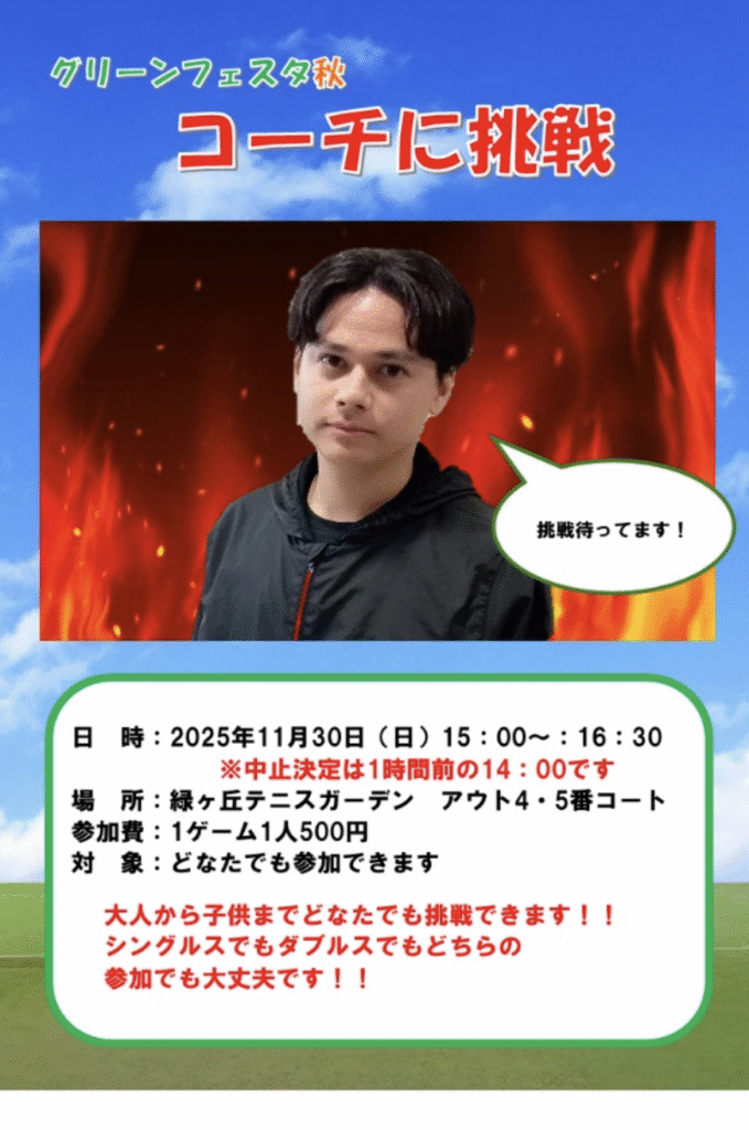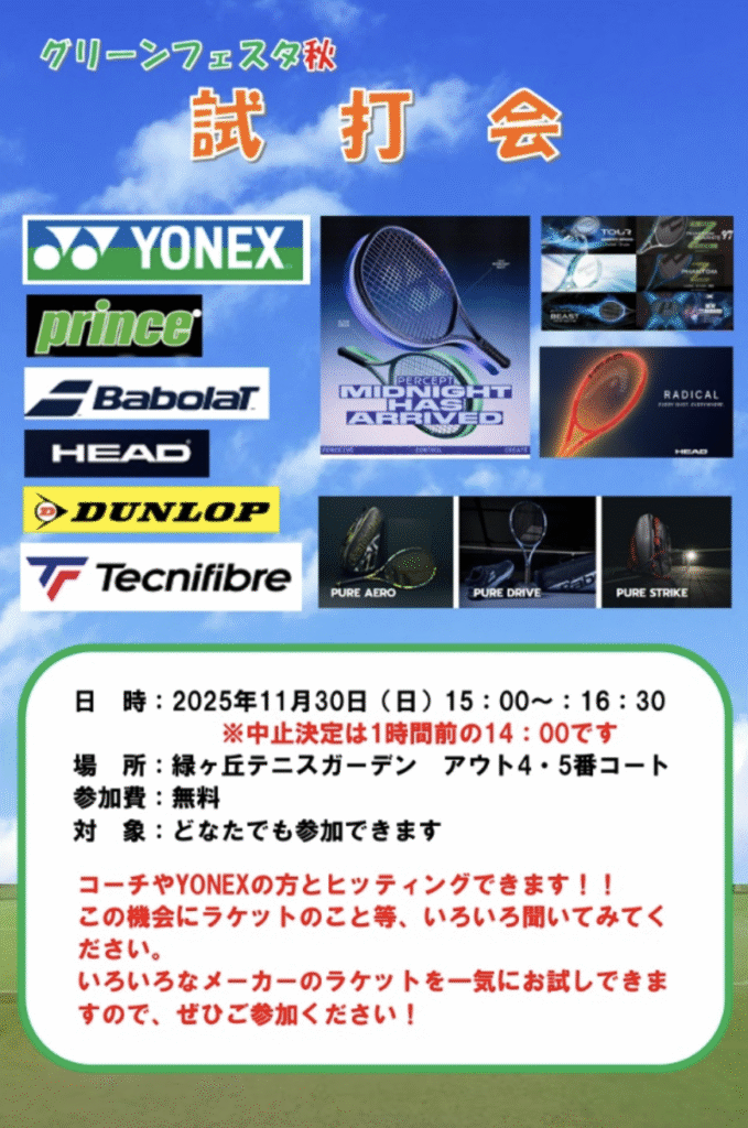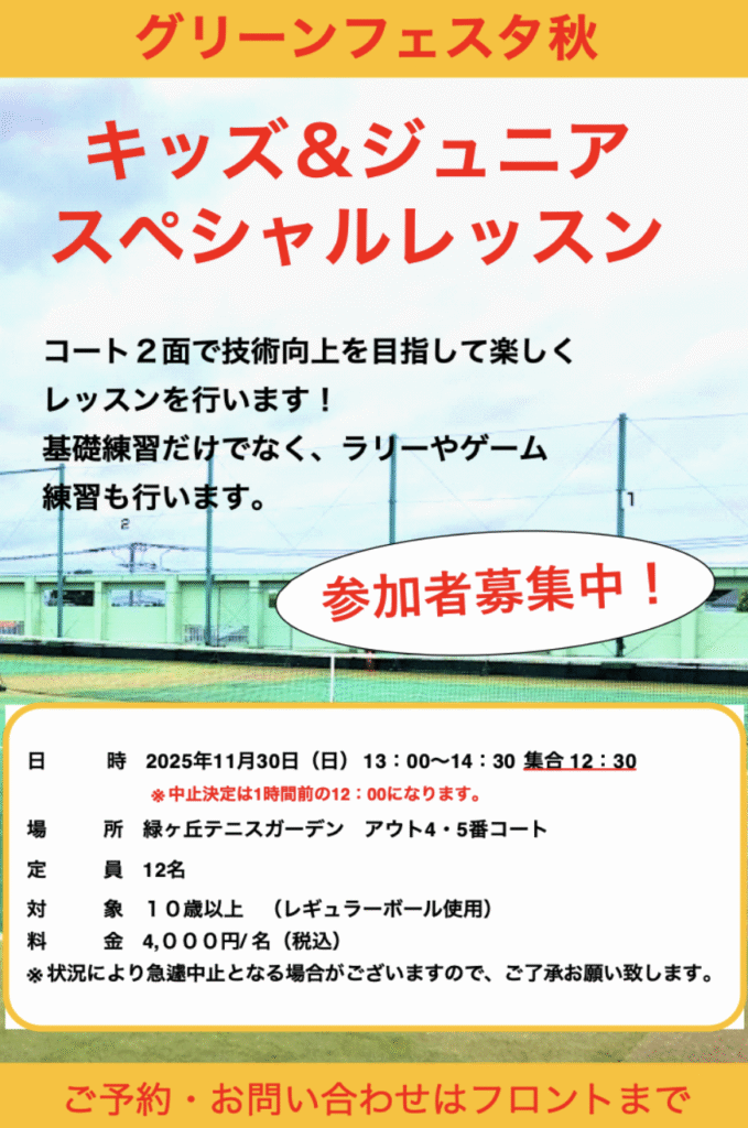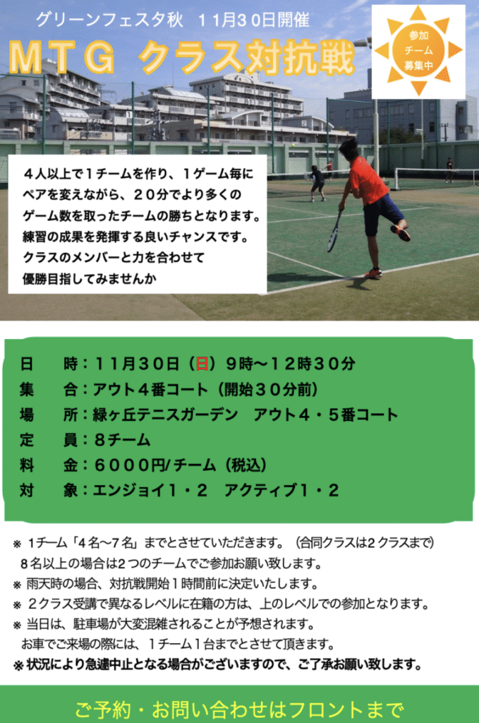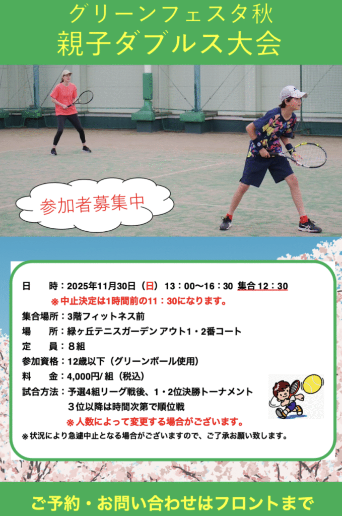 グリーンフェスタ秋では、親子ダブルス大会、クラス対抗戦、ジュニアレッスン、試打会、コーチに挑戦が行われます。