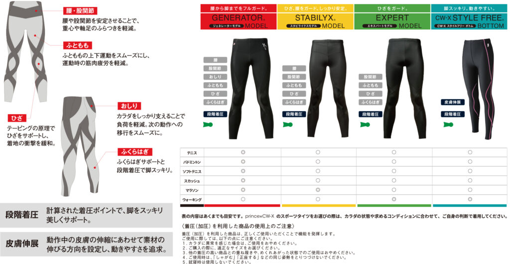 CW-Xは、独自のサポートライン設計とテーピング理論で筋肉の振動を抑えて動きを安定させるのが大きな強みとなります。