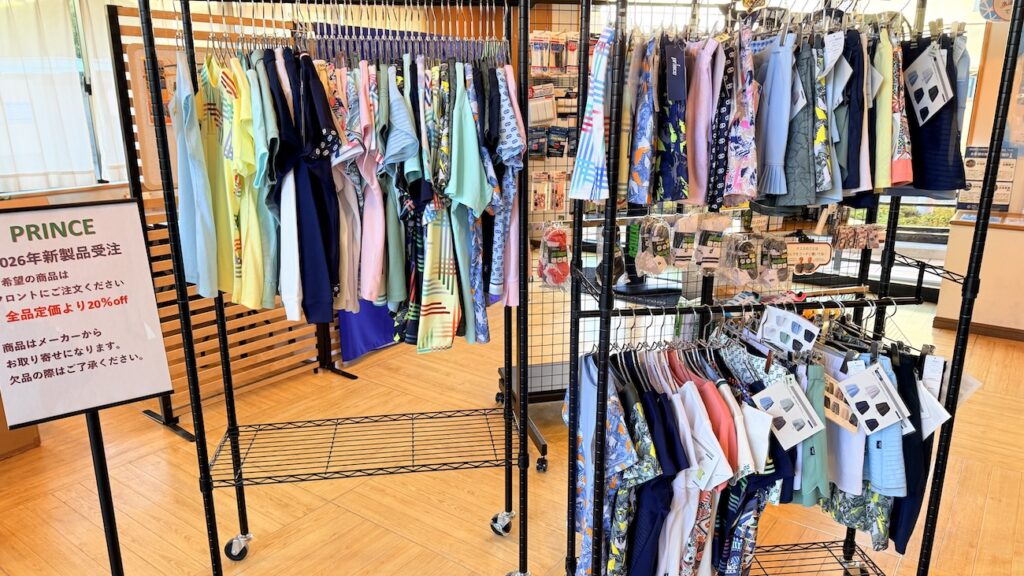 スクール1階のショップコーナーに見本ウエアをディスプレイしておりますので、実際に手に取ってご覧いただきながら、ご希望の商品をお選びいただけます。