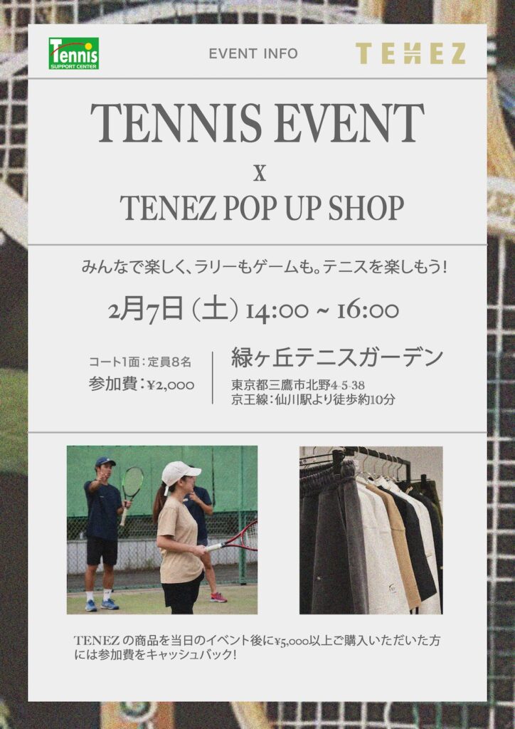 2/7(土)緑ヶ丘テニスガーデンにて話題沸騰中の「TENEZ(テネス)」のウエア販売会とオンコートクリニックを実施します!